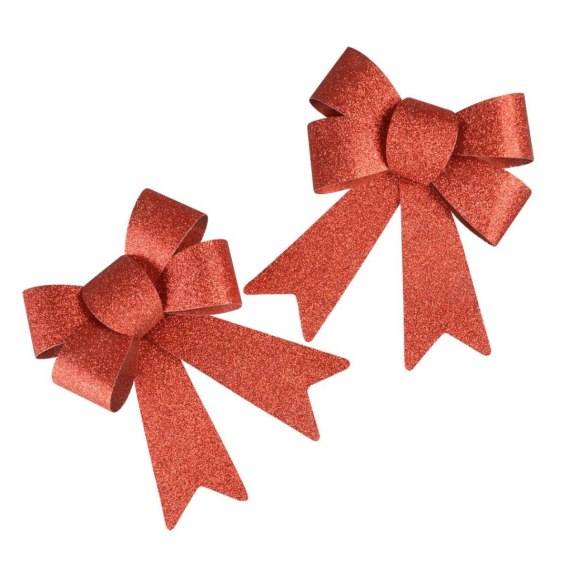 Zestaw dwóch kokard dekoracyjnych w kolorze czerwonym. Produkt wykończony brokatowym zdobieniem - pięknie mieni się w świetle. Idealnie sprawdzi się w kompozycjach dekoracyjnych, świątecznych jak i do dekoracji prezentów. Wymiary jednej kokardy to 13,5x17,5 cm.